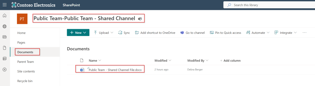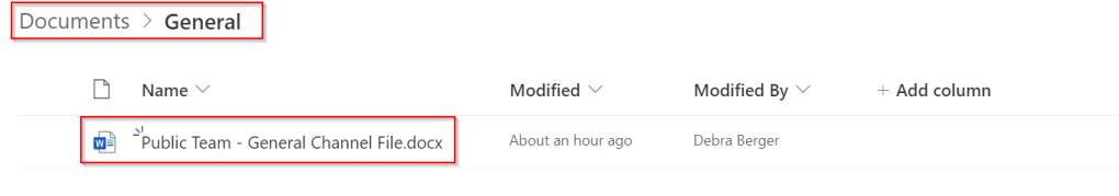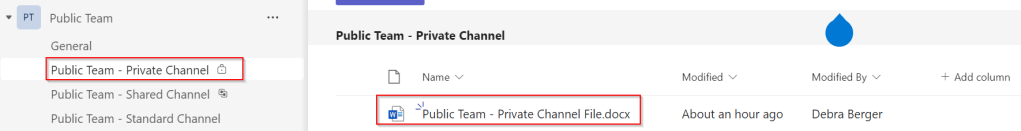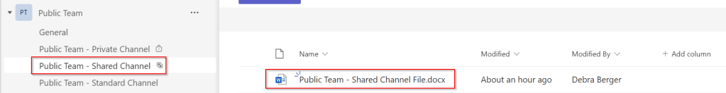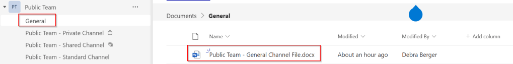 To figure out where files are stored in each type of channel, I’ve populated the channels in the above teams with a Word file containing the name of the team and the channel. Now, let’s find out where all your hard work is stored on Sharepoint. A sharepoint team folder is created for each team that you created in Teams. (How is that for number of occasions of the word “teams” in one sentence? 😁). This can be seen when we take a look at the SharePoint team site for the public team that was created: