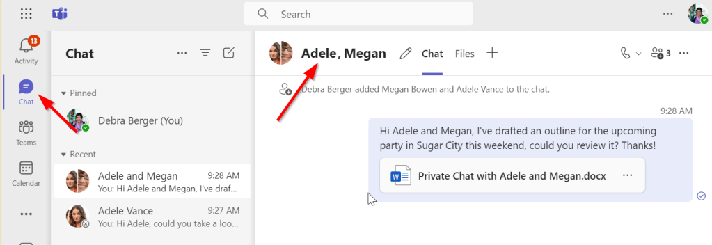 In this example, I’ve started a 1-on-1 chat with Adele and a separate group chat with Adele and Megan: