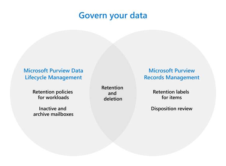 Governing your data within the Microsoft 365 ecosystem is done using 2 solutions. “Microsoft Purview Data Lifecycle Management” and “Microsoft Purview Records Management”. The following image shows the overlap in both solutions: