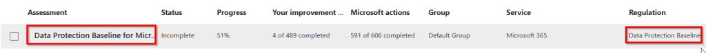 It also shows that it is based on the “Data Protection Baseline” regulation and that’s currently scanning our environment (progress at 51% in the screenshot above) to check all the controls in the assessment. This assessment checks your environment on a set of controls for key regulations and standards for data protection and general data governance. You should check out this Microsoft Learn article if you would like to know more about the Data Protection Baseline assessment.
