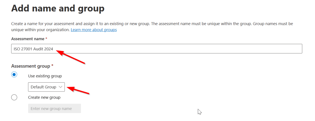 - Give your assessment a name. Remember that assessments can be grouped together? Here the wizard provides you with this possibility. I choose to go with the default group for this demonstration. Click next.