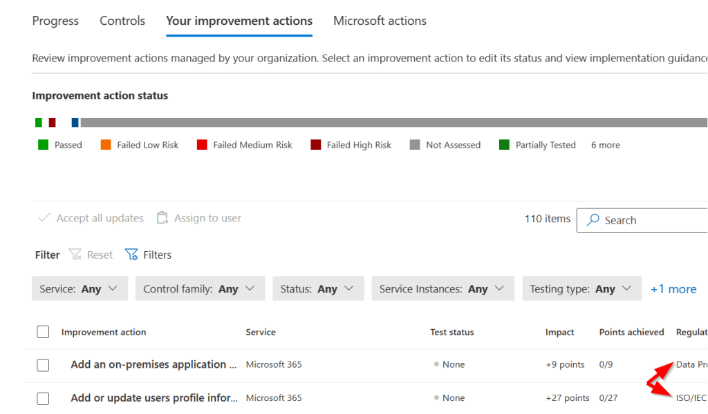 Remember that grouped assessments can share the same improvement actions? Also remember that I choose to put my ISO 27001 in the default group? Well, as you can see in the screenshot above, the Data Protection Baseline is also in this group and so the improvement actions are also shared in one view. So when you click the “Your Improvement Actions” tab, it’ll show you the controls you have to change to comply with the regulation you selected.