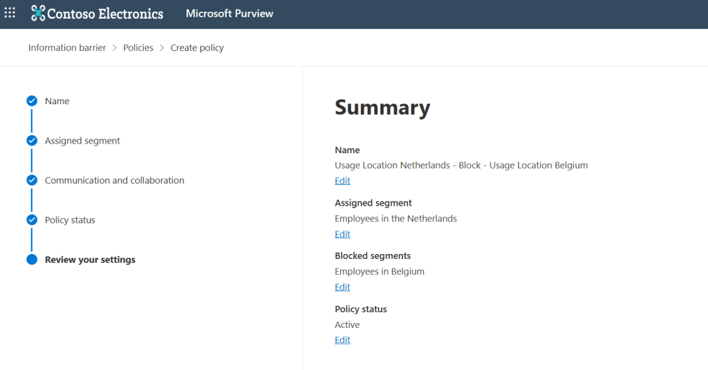 Next, let’s configure policies. Policies are the glue between segments as you can choose to block or allow communication between segments with them. Under the information barriers section, click “Policies” and select “Create Policy”.