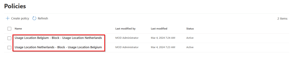 Review the summary and finish the wizard. Now the first policy is created. Now here comes the first catch. To be able to apply this policy, you should make the same policy in reverse. What I mean by this is that you also have to create a policy where users with usage location Belgium should block users with usage location Netherlands. This has to be done because 1-way communication blocks are not supported.