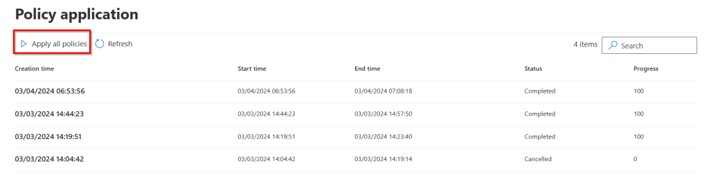 Navigate to “Policy application” under the Information Barriers section and press “Apply all policies”. The status will cycle through the phases NotStarted, ApplyInProgress, PendingCompletion and Completed. I would advise you to take your time and wait at least 24 hours after applying your policies to make sure they are distributed through your entire environment as otherwise your experience will not be consistent through the entire environment.