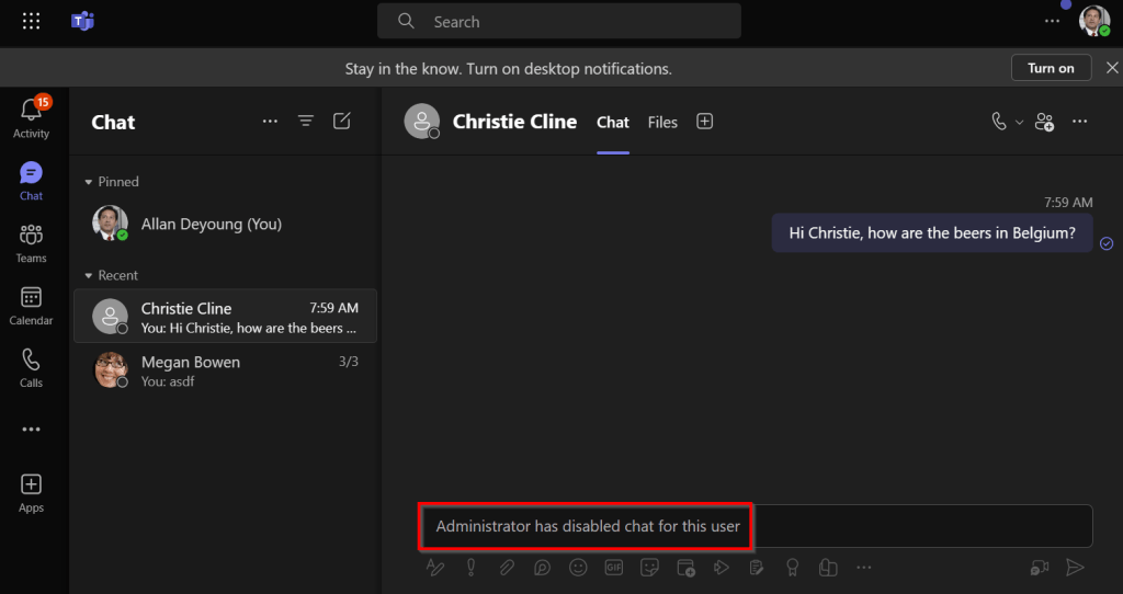We receive a message that an “Administrator has disabled chat for this user”. This is ofcourse because both users are on different segments and we’ve blocked communication between these segments. Of course this works both ways, Christie is also not able to communicate with Allan anymore and Teams is displaying the same message in her Teams client.