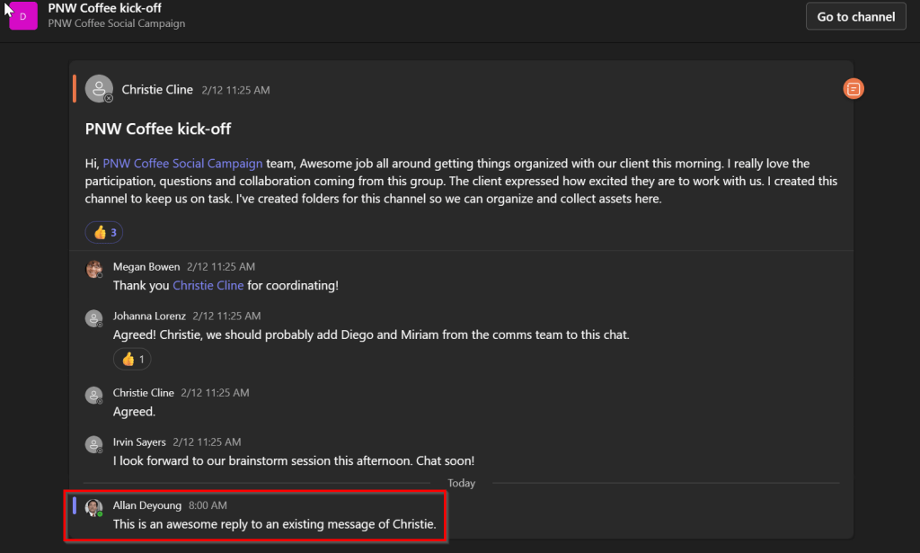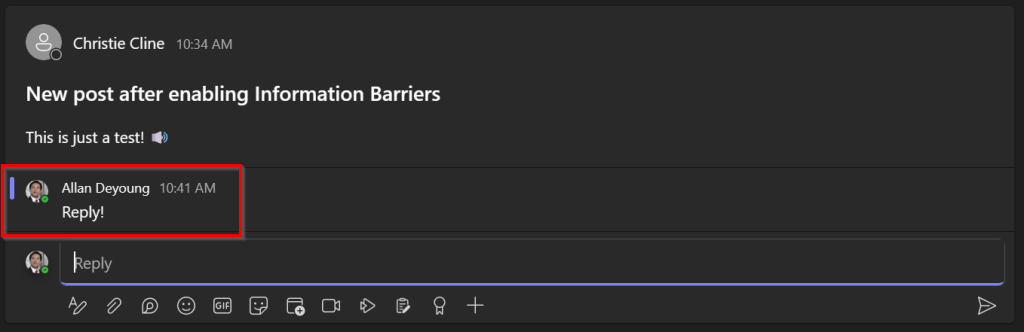 When there are no information barriers in place, users may communicate freely with other users in your Microsoft 365 tenant. In the example above, you can see that user Allan Deyoung can communicate with Christie Cline using Teams chat and reply to a post made by Christie in the “PNW Coffee kick-off” Team.