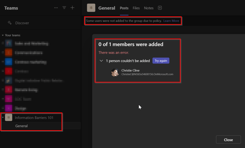 Allan is immediately notified that some users were not added to the group due to policy. In this case this would be Christie, since she’s in another segment to where communication is blocked.