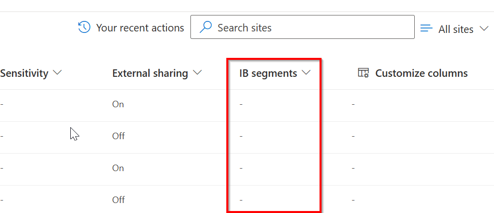 Now, Navigate to the SharePoint Online Admin Portal and click Active Sites. You should see a column named “IB Segments” as in the screenshot above. Information Barrier Segments are now enabled for your SharePoint sites.