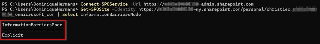 Get-SPOSite -Identity https://TenantName-my.sharepoint.com/personal/christiec_TenantName_onmicrosoft_com | Select InformationBarriersMode