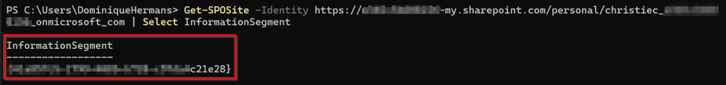 Get-SPOSite -Identity https://TenantName-my.sharepoint.com/personal/christiec_ TenantName _onmicrosoft_com | Select InformationSegment