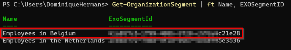 As shown in the screenshot above, the result returned is not the name of a segment, but a GUID. This GUID should be matched with the GUID that’s a result of the “Get-OrganizationSegment” cmdlet.