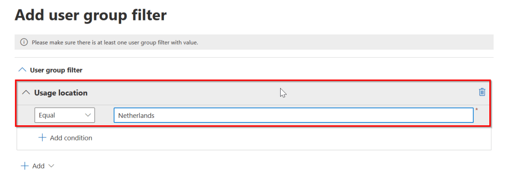 Next, create the group filter. Here I’ll use “Usage location” Equals “Netherlands”. This will form a group of all users in my tenant which have property usage location set to Netherlands.
