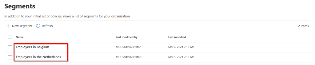 First, we are going to create segments. Segments are used to create a group of users based on a common property. In this example, I will use the property “Usage Location”. Other properties that can be used are for example Department, Street etc.