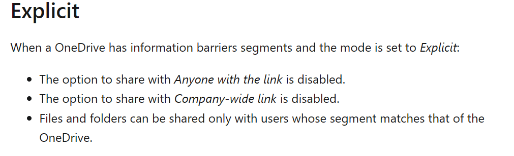When we enabled Information Barriers for our SharePoint environment, we also enabled it for our OneDrive environment. So that’s a nice advantage. As with SharePoint, OneDrive can also be configured with different Information Barrier Modes: