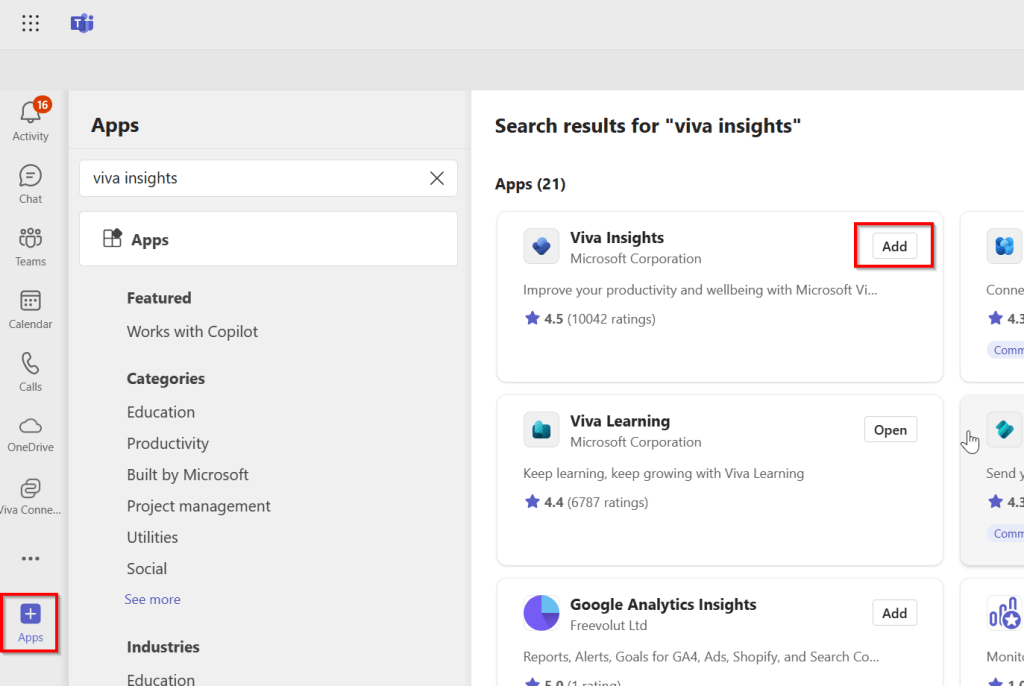 Navigate to Teams, select “+ Apps” and search for “Viva Insights”. Click Add twice to add the app to Teams.