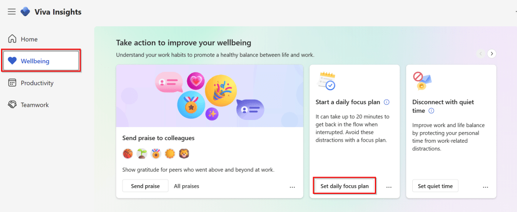 Navigate to Viva Insights, and click “Set daily focus plan”. When this is done, the text of the card changes into “change settings”. Click it.