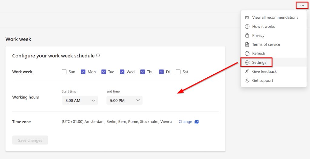 Navigate to Viva Insights on the left side of Teams (you might have to click the three dots to see Viva Insights). Select the 3 dots on the upper right corner of the screen, select settings and change your workdays and hours accordingly. Hit “Save changes” and close the settings pane.
