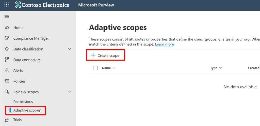 As adaptive scopes can be used in retention policies and communication compliance policies, they can be found under “Roles & Scopes”, “Adaptive Scopes” in the Microsoft Purview portal. Click “Create Scope” to create a new adaptive scope.