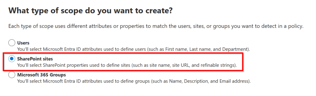As an adaptive policy scope “groups” objects together based on a query, we have to specify which objects we want to group. This can be users, SharePoint sites or Microsoft 365 groups. If you want to know what type of attributes or properties you can query, take a look at this Learn article. In this example, I choose “SharePoint sites”.