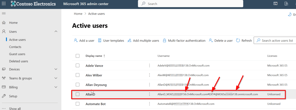 • A guest account for “AllanD” from the “156” tenant is added as a guest in the format that is explained in the beginning of this article.