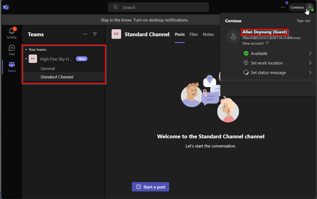 Allan is now signed in to my organization / tenant using his guest account and can access the team and standard channel.