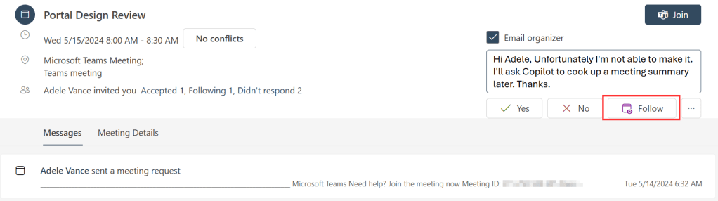 1 of the attendees (Allan Deyoung) receives the invitation but isn’t available at the requested time. He writes a short message to organizer Adele and clicks the “Follow” button, that has replaced the “tentative” button.