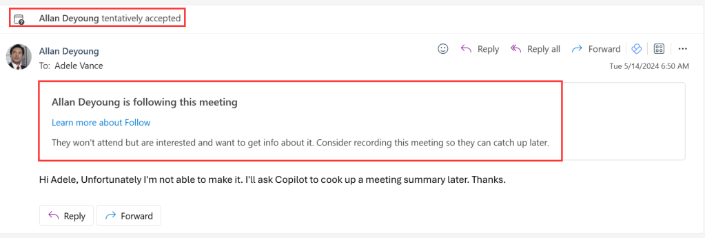 Adele now sees Allans reaction as “tentative” and receives a message stating that Allan is following the meeting attached to the response. Outlook gives Adele a subtle hint to maybe record the meeting so Allan can catch up later.