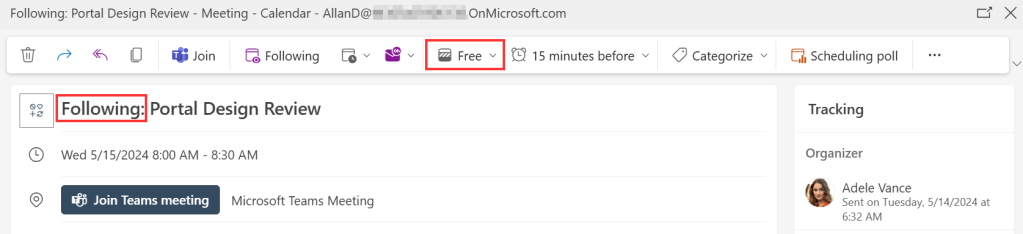 Now back to Allan, the meeting is placed in his calendar and the meeting subject now has a prefix called “Following:”. Also note that Allan is not showing up as “busy” during the meeting, but as free.