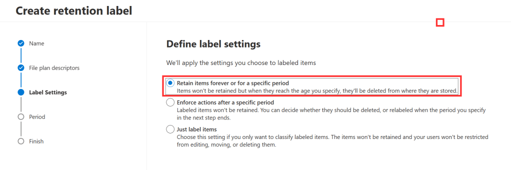 In the next screen we can configure what will be done to files or items that are labeled with this label. For this demo, I choose to go with “Retain items forever or for a specific period” because I want to show you the disposition list feature in Records Management.