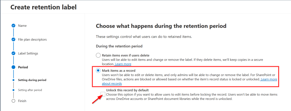 First, we’ll have to choose what happens with your items (files) during the retention period. Since we want to check out record management, we’ll mark the items as a record.