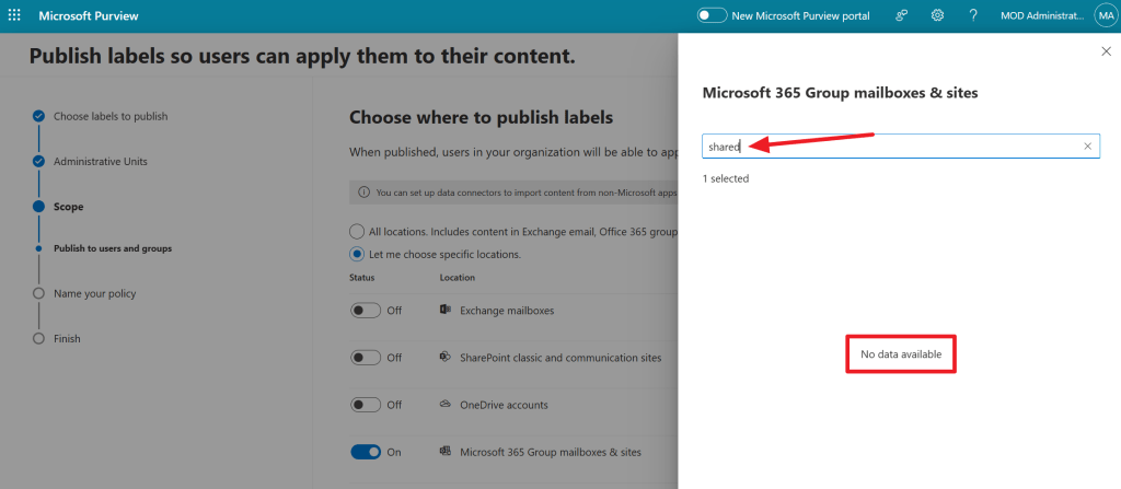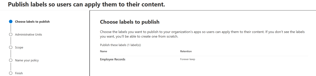 We are going to publish the previously created label called “Employee Records”. If you need more context on where in the configuration process of retention labels we are, take a look at my articles on Data Lifecycle Management or Records Management.