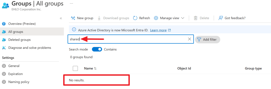 However, when searching for “shared” or “private” to find the channels that have their own SharePoint site, no groups are found, simply because they’re not based on a M365 Group!