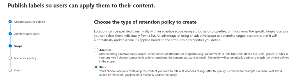 We skip the admin units screen and in the above screen, we choose “Static” as the type of retention policy so we can select the SharePoint sites ourselves using this wizard.