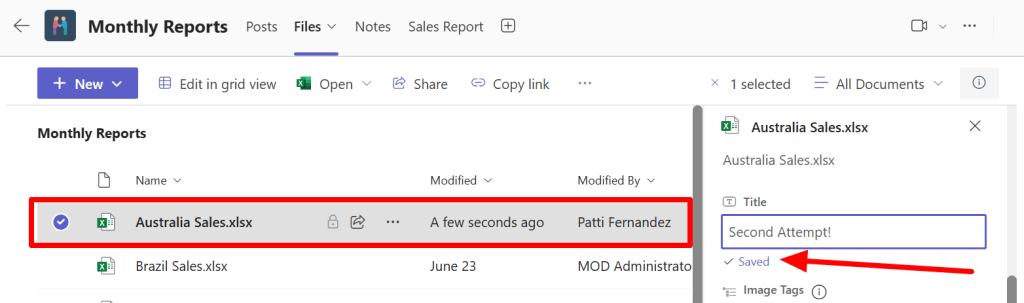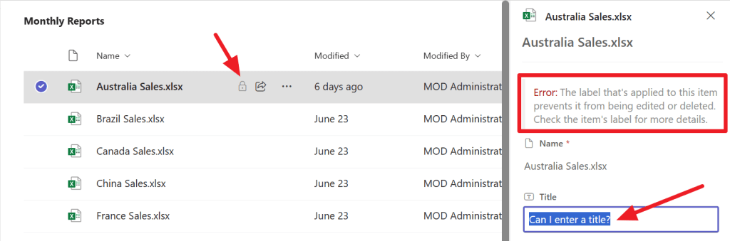 In the above example, the ‘Australia Sales.xlsx’ file is marked as a record as we can see a lock icon. When I want to rename the title property of the file an error appears stating ‘Error: The label that’s applied to this item prevents it from being edited or deleted. Check the item’s label for more details.’.