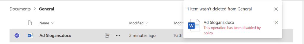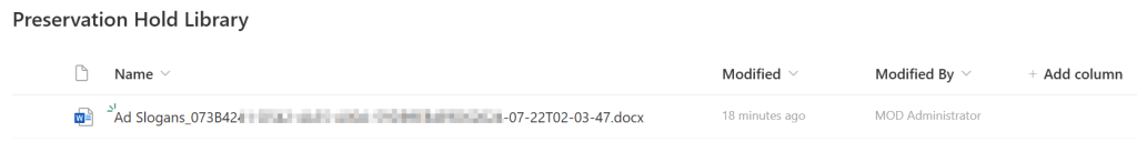 When looking into the folder, we can now see that our ‘Ad Slogans.docx’ file is now moved here and now has a suffix added to it’s name containing a GUID that resembles the unique document ID of the original document and a date/timestamp.