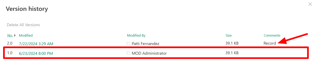 - The copy created in step 2 is added to the version history of the original document. The comments field is stamped with the word ‘Record’.