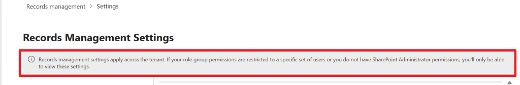 At first, we are greeted with a banner telling us that “Records management settings apply across the tenant. If your role group permissions are restricted to a specific set of users or you do not have SharePoint administrator permissions, you’ll only be able to view these settings”. In other words, if your role group permissions restrict you to not see all users or you don’t have SharePoint Administrator permissions, you are not able to set up one of these global settings.