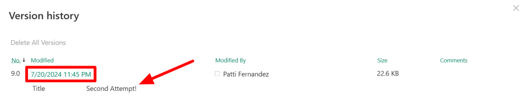 While we are not able to see the exact change in the audit log, we can by looking up the version history of the file and match the timestamps. Do note that in this example timestamps differ a little bit because of different time notations used.
