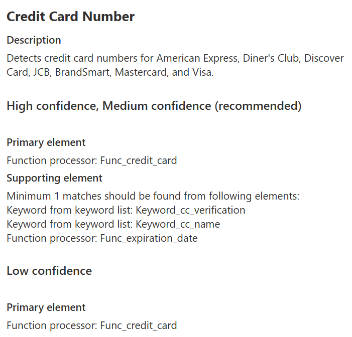 - Primary and supporting elements that define the logic to find that a number found is actually a Credit Card Number. The more elements that are matched, the more certain Purview is that a match is actually a Credit Card Number in this case. If all of the above elements match, it’s considered to be a High confidence or Medium confidence match. If only the ‘Function processor: Func_credit_card’ matches, it’s considered to be a Low confidence match. You can see that this confidence level is also used in the policy properties where we looked at ‘high volume’ and ‘low volume’ properties.