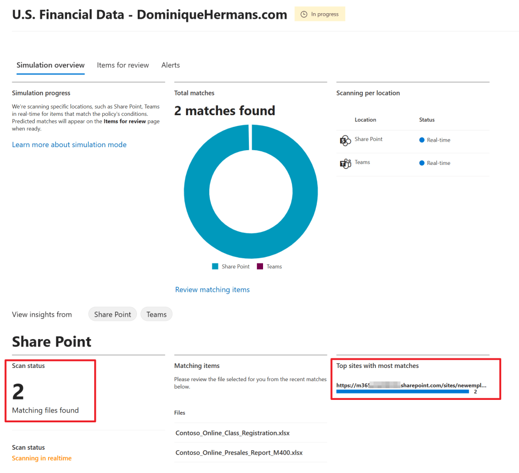 Here you’ll find an overview of the matches found in your organization. In my case, 2 matching files are found which both are found in 1 SharePoint site.