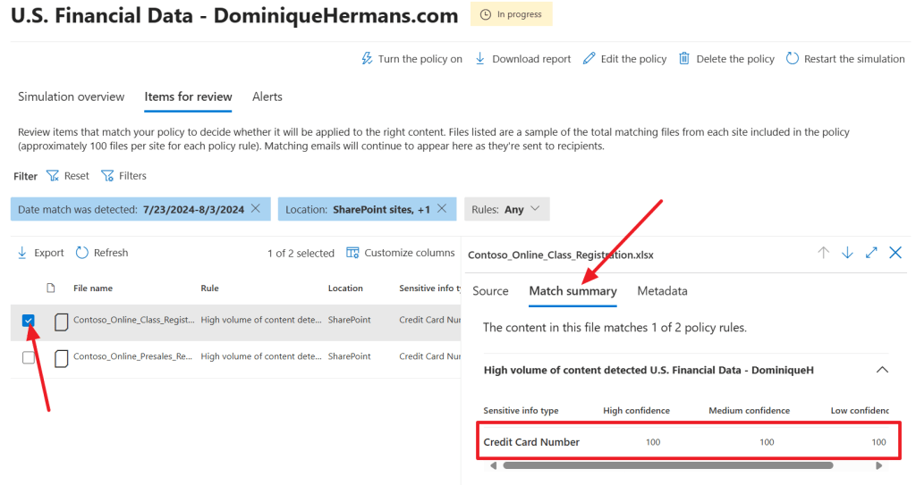 When you click on the ‘items for review’ tab followed by the ‘match summary’ tab, you can select an item. At the right hand side, the portal shows which sensitive information type was found in your document by confidence level. So it could be true that a SIT was identified using the ‘low confidence’ logic, but not by the medium or high confidence logic that was configured in the SIT. In this document however, the configured SIT (Credit Card Number) was found 100 times by low, medium and high logic defined in the SIT.
