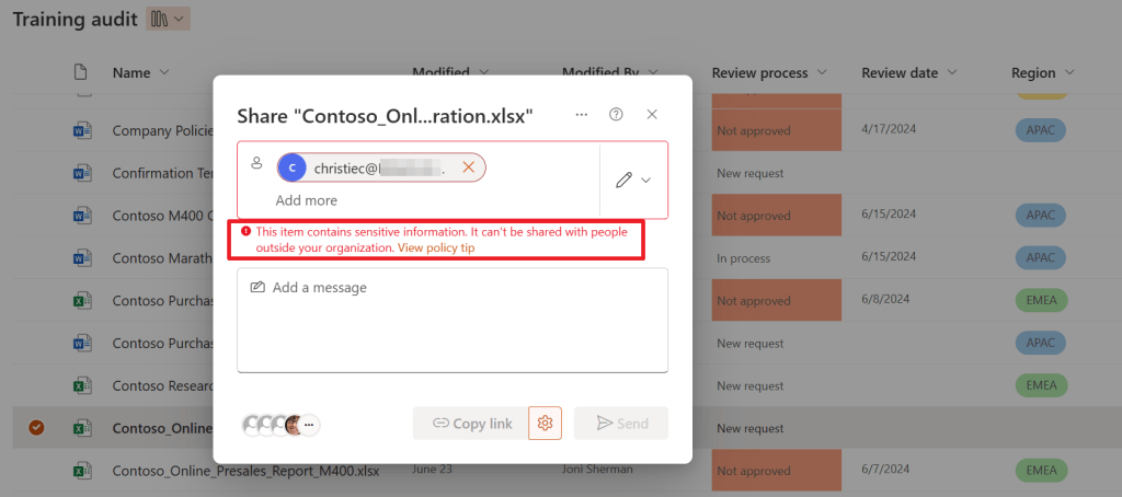 As you can see, the file can’t be shared because it contains sensitive information, which was found using the SIT we configured in our DLP policy!