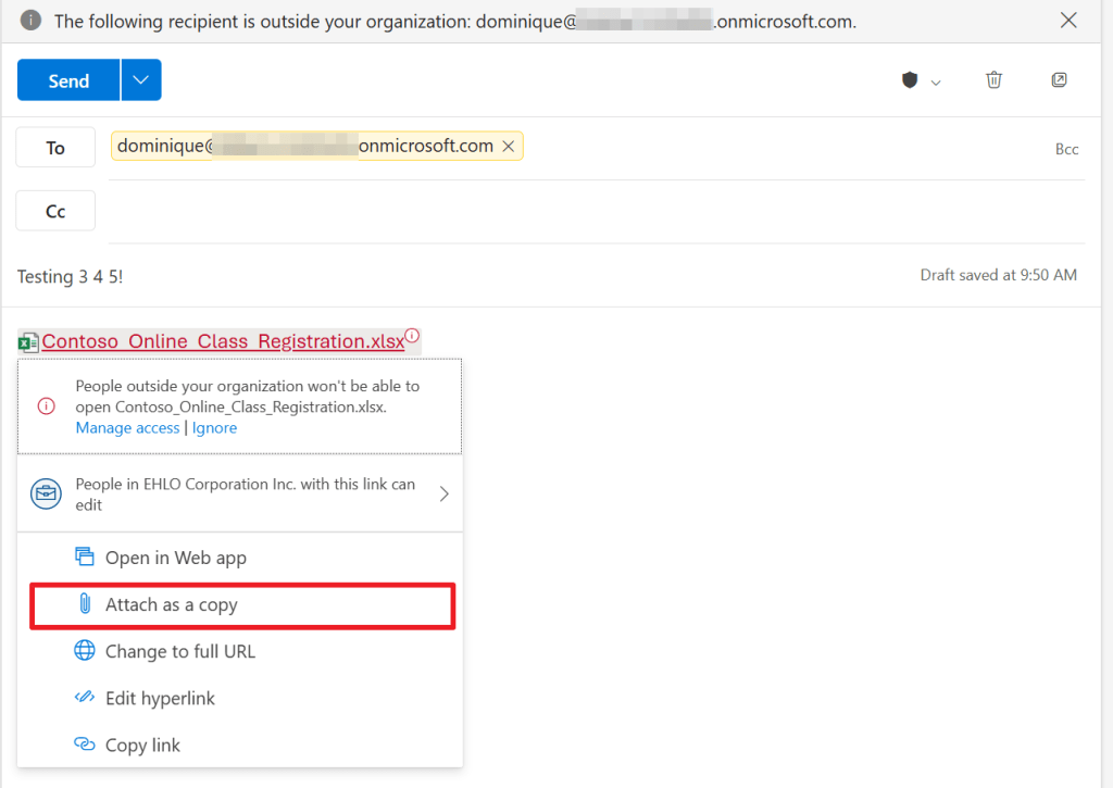 Now let’s try to work around this by using Outlook for Web. When adding a link to the document, here also a message appears that people outside your organization won’t be able to open the file.