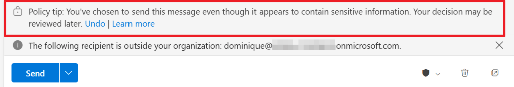 Another policy tip appears stating that your decision may be reviewed later as you’ve chosen to send this message even though it appears to contain sensitive information.