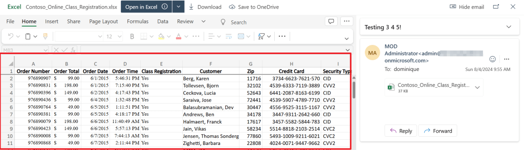 Let’s take a look at the ‘Contoso_Online_Class_Registration.xlsx’ sheet. Here, credit card info is found. Actually a list of 100 entries (which I shortened for readability) can be found in the sheet which matches the score above. As configured, the policy tip is also shown to the user. It’s also possible to customize the policy tip if necessary.