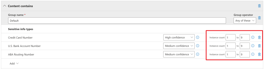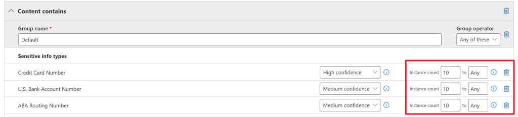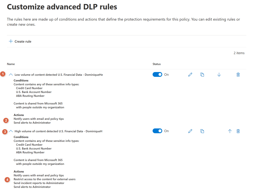 The rules that are included in the ‘U.S. Financial data’ policy match data on the following sensitive info types, or SIT’s, that can be seen in the screenshot above tagged with label ‘1’ and ‘3’: