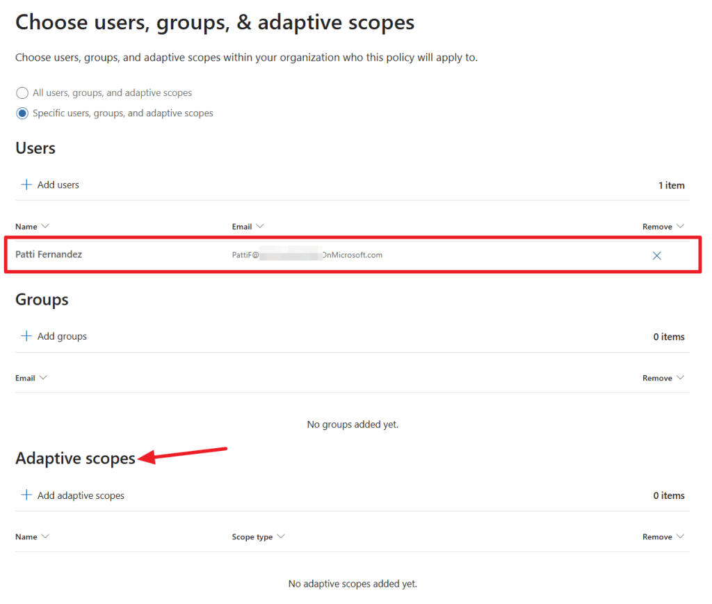 Next we can use an adaptive scope or select users and groups to which we want to apply this policy. To makes things simple for this example, I’ve chosen to apply the policy to a user named ‘Patti Fernandez’ only. In the next screen, we can choose to prioritize content on a specific SharePoint site, or content that contains sensitivity labels or certain sensitive info types.