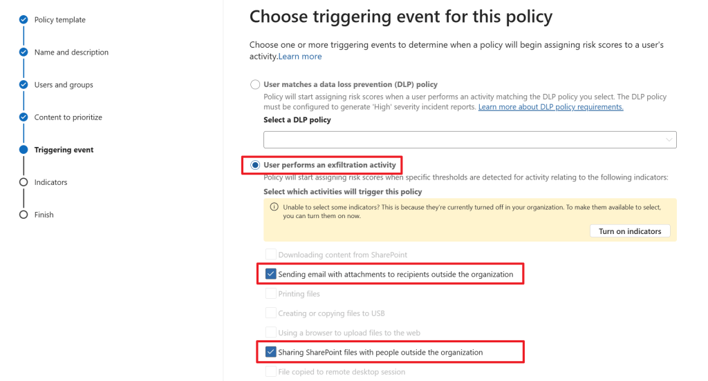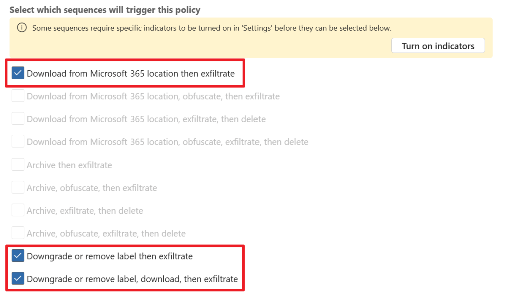 Like the help text tells us, policy indicators are the actual activities you want to detect in your environment. These can be Office indicators like in the screenshot above. For example, downloading content from SharePoint, Syncing content from OneDrive and so on. There are also indicators from other categories, like device indicators which let us monitor activities on devices. Examples here are creating or copying files to USB, printing files and using a browser to download content from a third-party site. In this case, I select all available office indicators for our demo. If the default indicators don’t match your needs, you can always create your custom indicators.