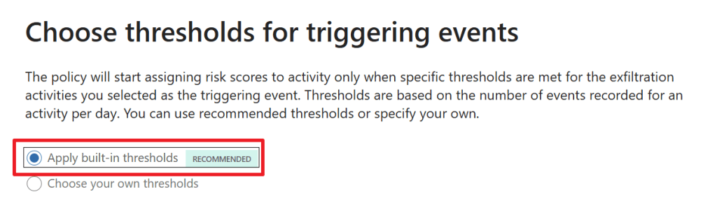 In the next screen, we have to choose which thresholds we want for triggering events. For example, here you can choose the number of times that a document is downloaded from a Microsoft 365 location and then exfiltrated.